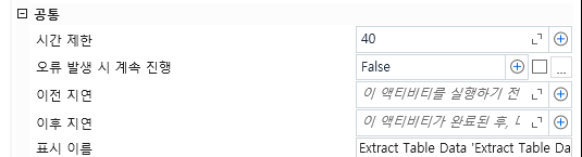 오류 발생 시 계속 진행이 디폴트 True로 되어 있었다. 이것을 False로 바꾸니 그제서야 Extract Table Data': 시간 제한에 도달했습니다라는 에러로그가 찍혀서 알았다.