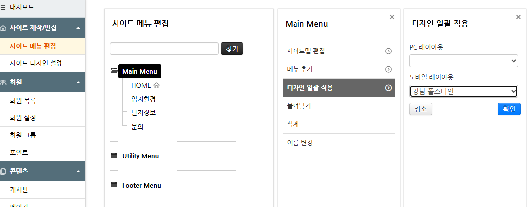 라이믹스 관리자 > 사이트 제작/편집 > 사이트 메뉴 편집 > Main Menu > 디자인 일괄 적용 > 모바일 or PC 레이아웃 >