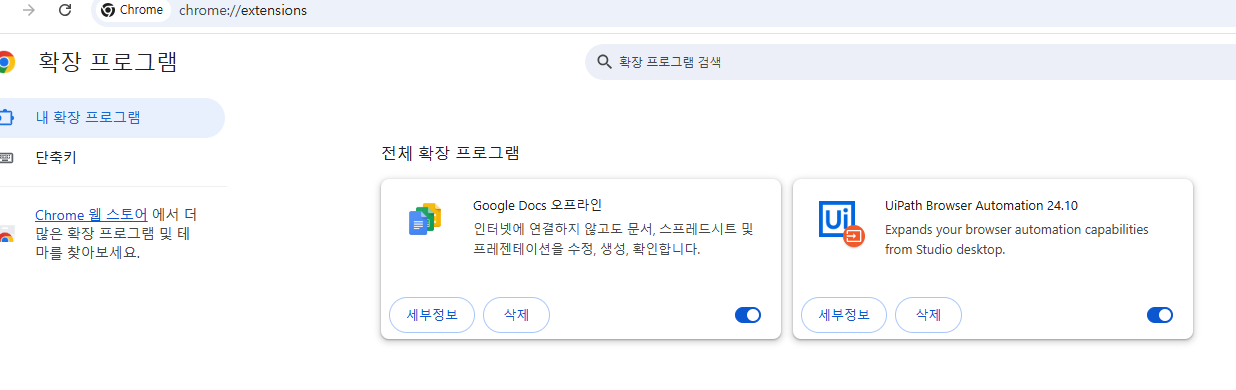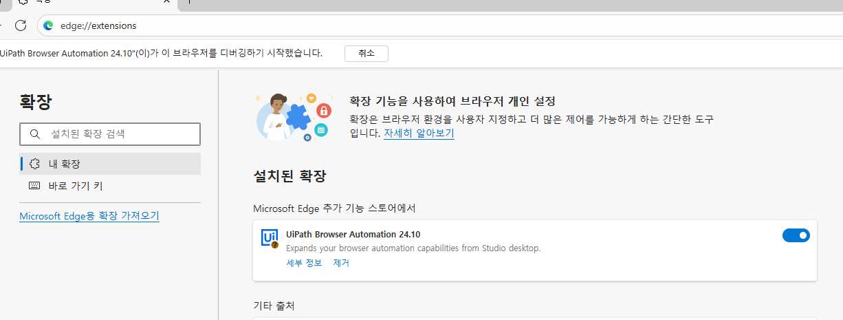 우측에 UiPath Browser Automation 24.10 이 보인다. 최초는 사용안함으로 되어 있는데 우측으로 밀어서 사용함으로 해준다.