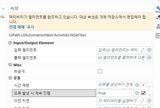 그래서 Get Text 속성에 오류 발생 시 계속 진행을 True로 해주면 될듯 싶다.