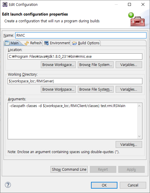Location 은 설치된 JDK 에 rmic.exe 를 지정합니다. 중요한 것은 Argument 에서 –d 옵션인데 RMIClient 프로젝트의 classes 디렉토리로 생성되게 합니다.