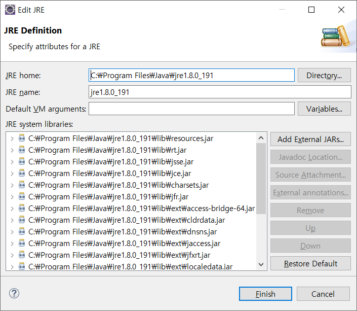 이클립스 Window -> Preference로 들어가서 Java -> Installed JREs Edit 버튼 클릭
