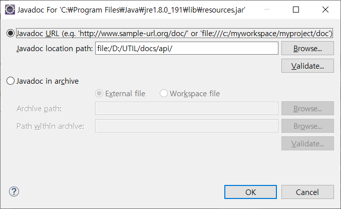 이제서야 Javadoc Location 버튼이 활성화 되었다.
