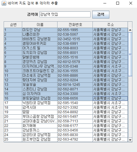 검색어를 입력받아 네이버 지도 검색해서 스크래핑, 크롤링 하여 정보를 보여준다.