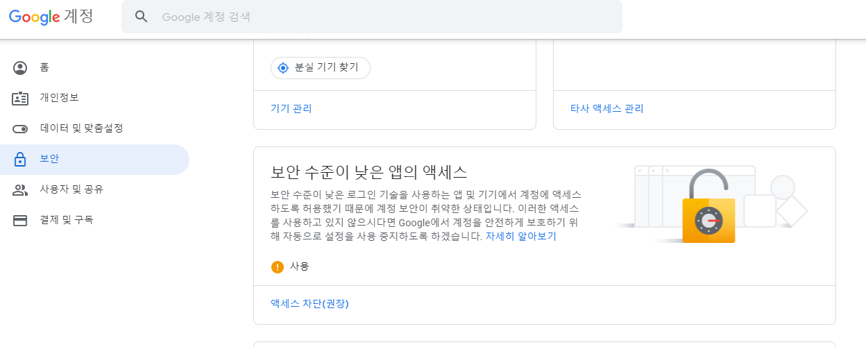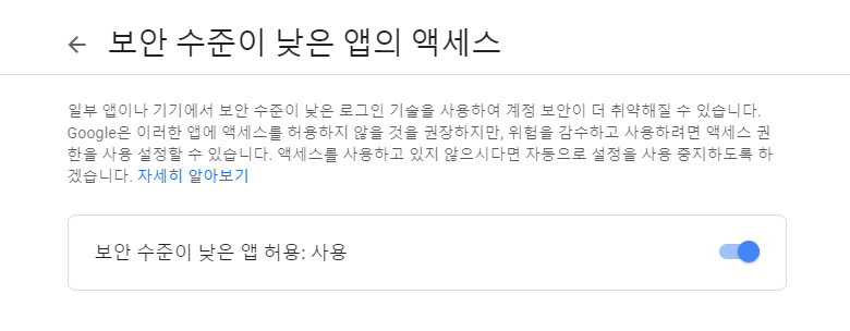 구글의 내계정 -> 보안에 들어가서 가장 하단에 허용함을 변경합니다.