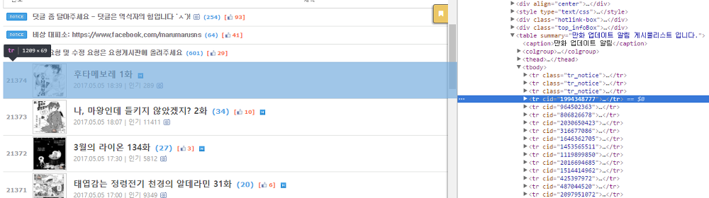 게시판은 table 태그를 사용하고, 각 행은 tr 태그에 매칭되며 공지사항은 tr_notice 클래스를 가지고 있다는 사실을 알 수 있다.