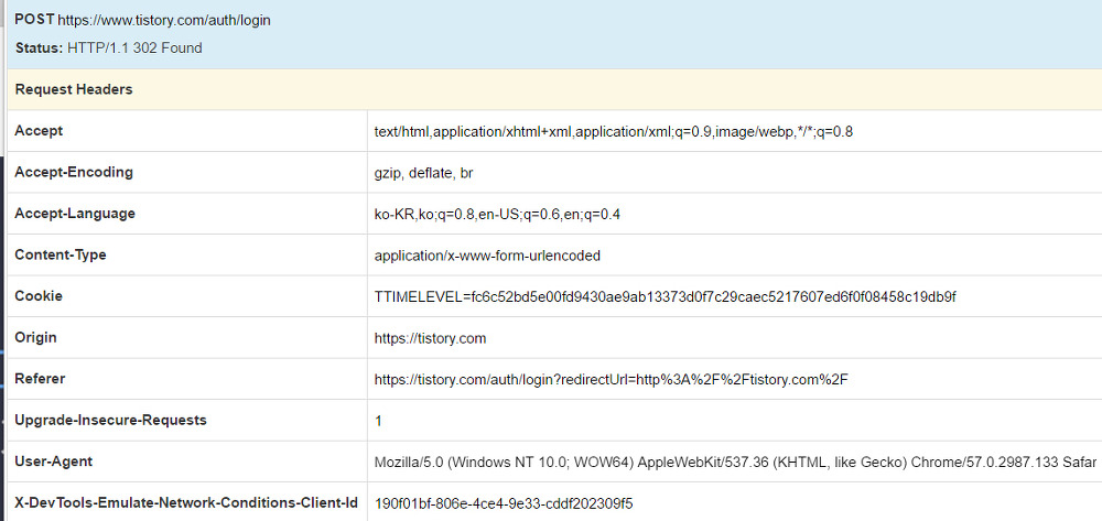 티스토리에 로그인할때 전송된 Request header