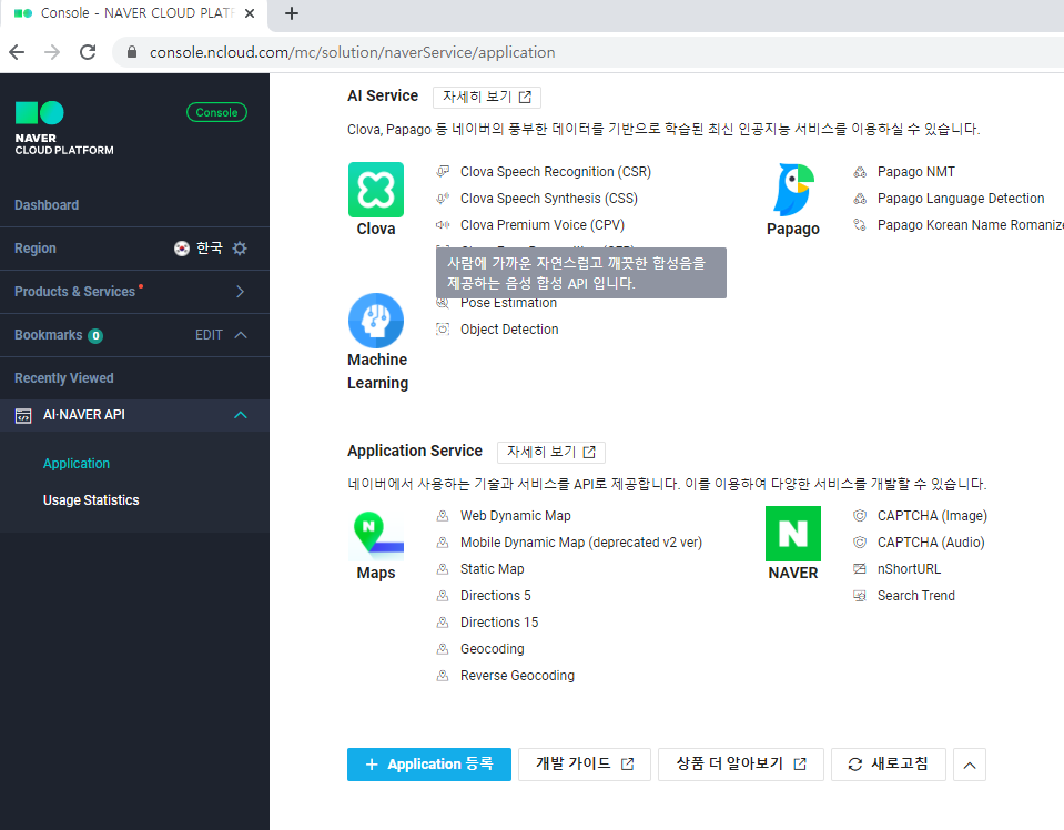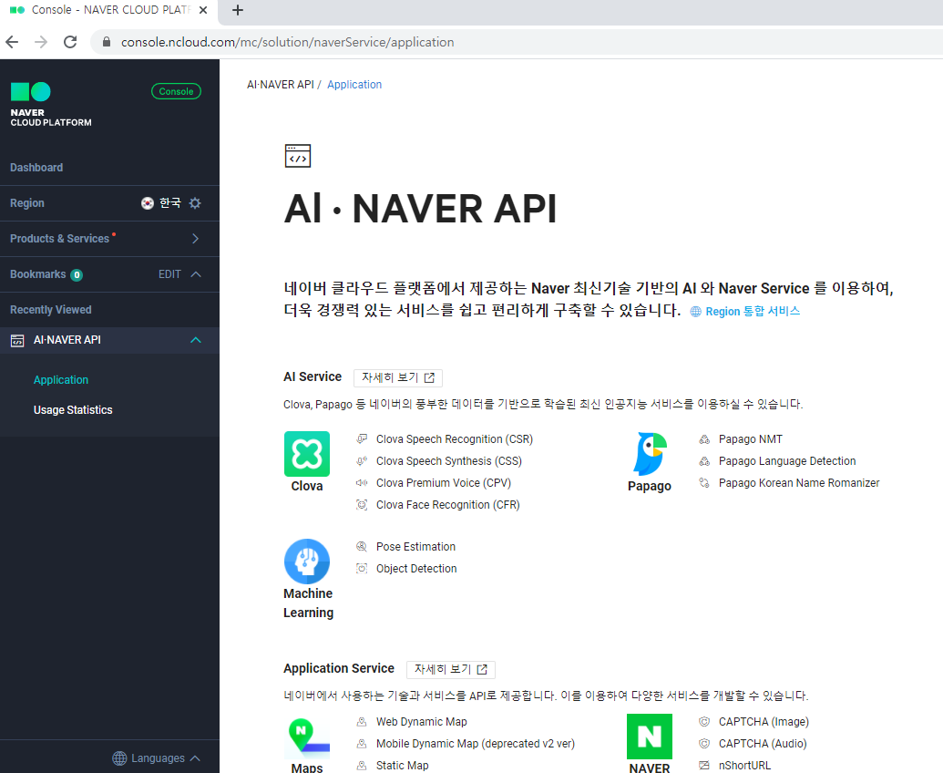 앞의 글에서 AI-NAVER API를 클릭하니 아래 캡처화면이 나타났다.