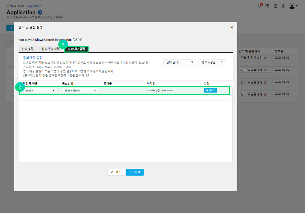 - 새로운 이메일 주소 또는 SMS을 추가하고 싶은 경우, 우측 상단에 있는 통보대상관리를 클릭하세요.