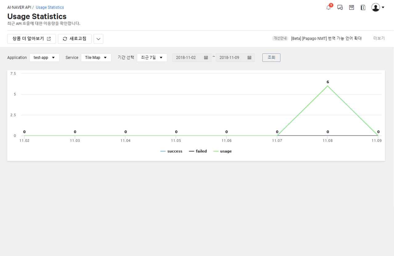 AI·Application Service > AI·NAVER API > Usage Statistics에서 확인할 수 있습니다.
