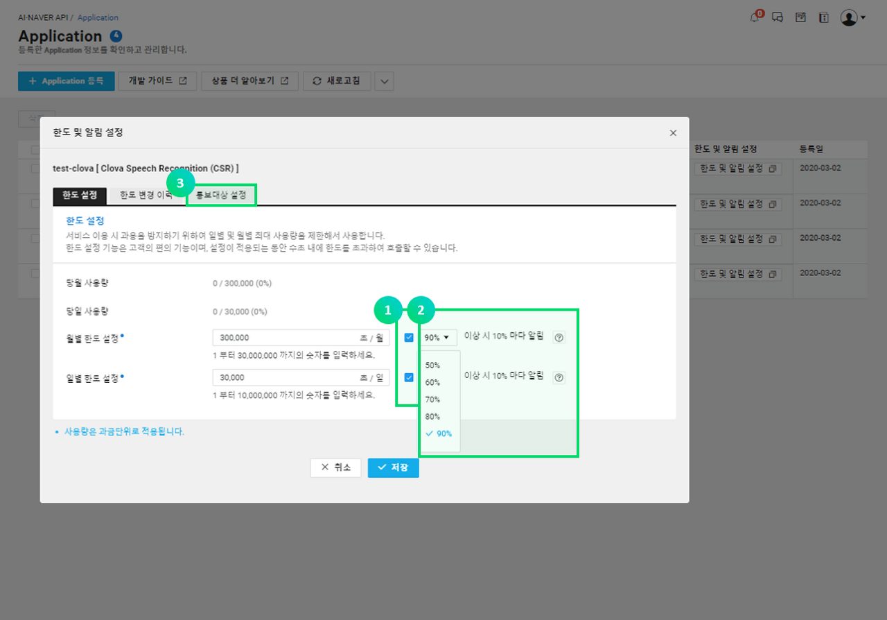 ③ 한도 및 알림 설정: API 호출 시 이용 한도와 특정 값(%) 초과시 알림 기능을 직접 조절할 수 있습니다.