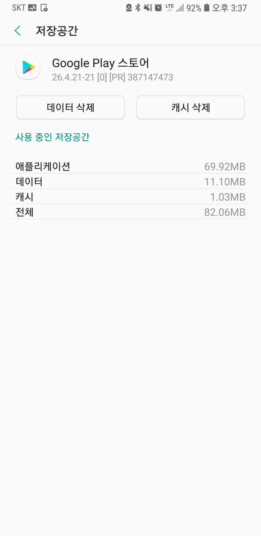 Google Play 스토어 > 저장공간 > "캐시 삭제" 버튼 클릭