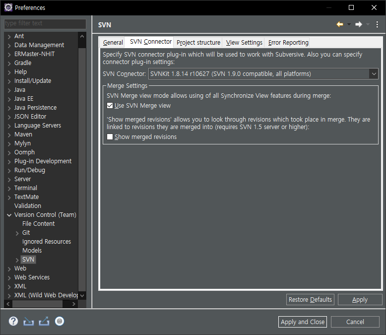 View에서 안보였던 SVN은 보였는데 Svn Connector 에러가 났다.