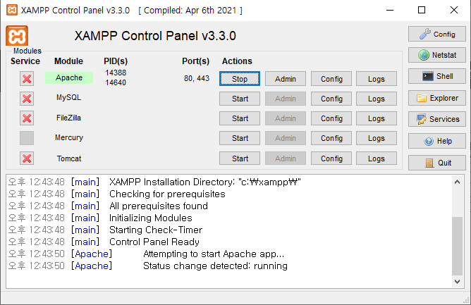 만약 안나오면 아파치 서버가 안 켜져 있을 수 있으니 XAMPP Control Panel 가서 Apache Start 버튼을 클릭하여 켜준다.