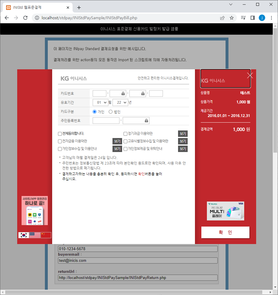 카드정보등을 정확히 입력하고 확인버튼을 클릭한다.