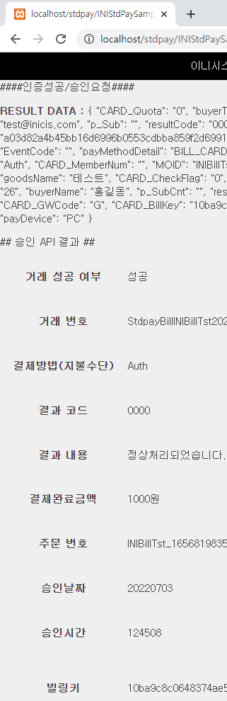 그럼 답변이 위와 같이 온다. 빌링키를 사용하면 된다.