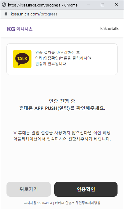 그럼 카카오톡 인증 지갑으로 스마트폰 알람이 오고 인증하기 버튼을 눌러 인증한다.