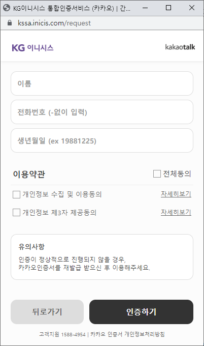 그랬더니 위와 같은 화면이 나왔다. 카카오톡 인증을 클릭해 본다.