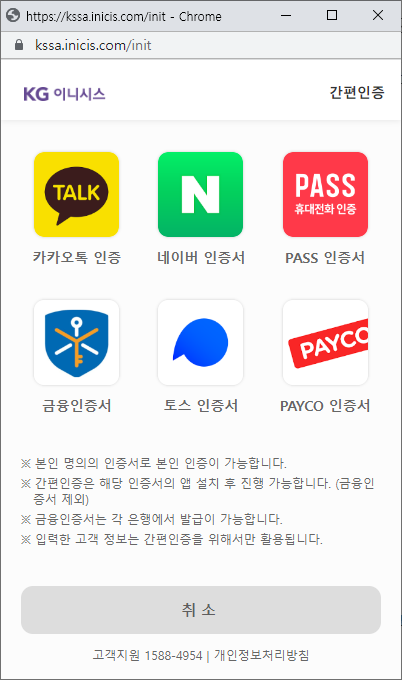 먼저 kg 이니시스 통합인증 사이트로 간다.
