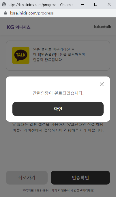 카카오 인증서로 인증한다. 그럼 인증이 완료되었습니다. 라고 나온다.
