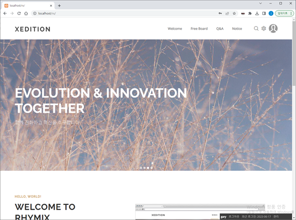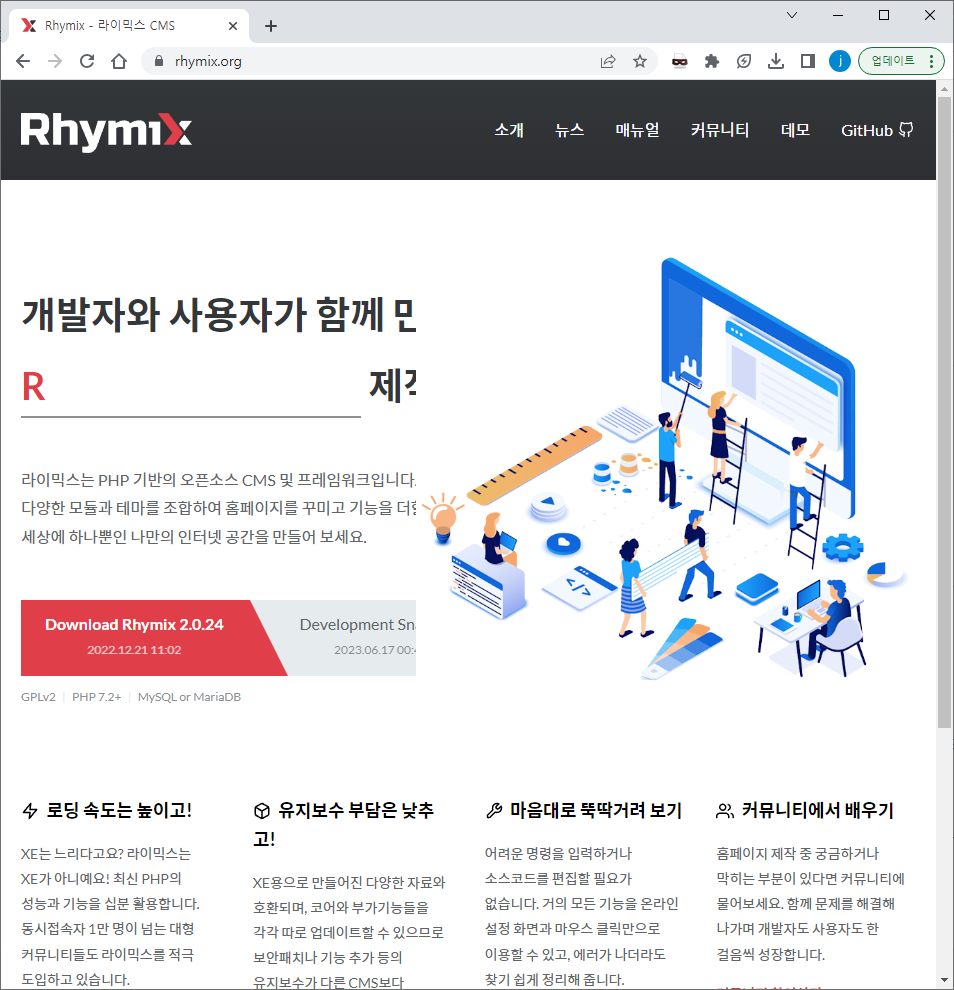 메인 화면에 Download Rhymix 2.0.24 를 클릭하여 다운로드를 받는다.