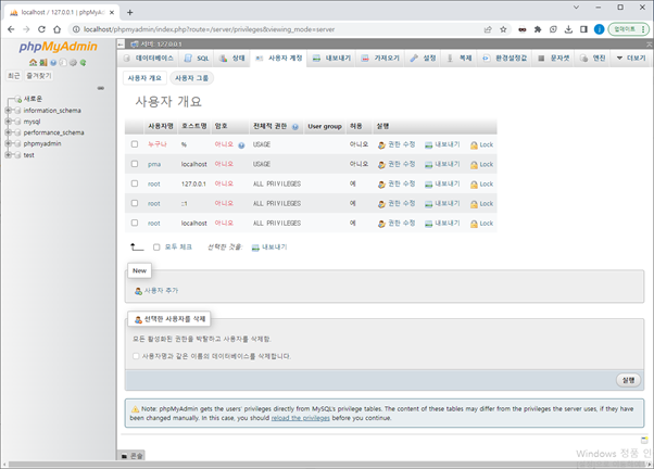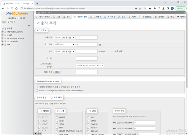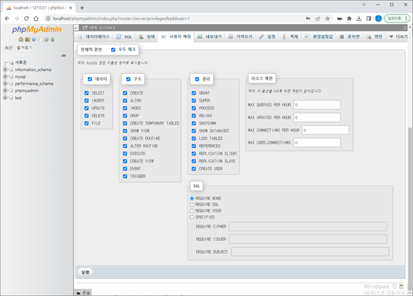 동명의 데이터베이스를 생성하고 모든 권한을 부여.체크