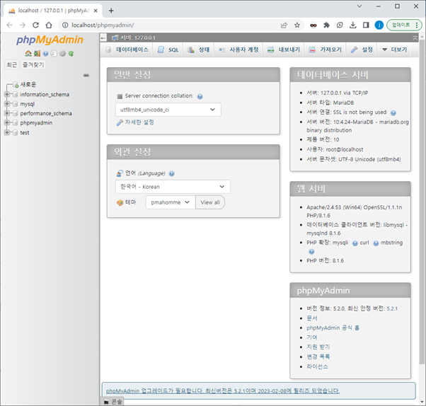 Xampp 컨트롤 패널에서 MySQL 부분 Admin 버튼을 클릭한다.