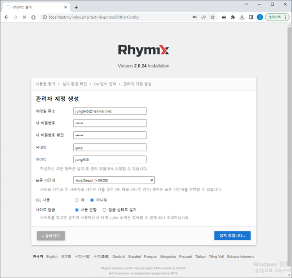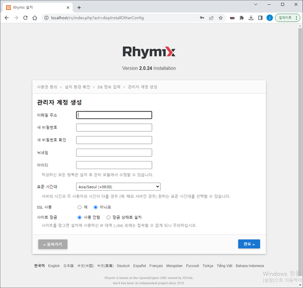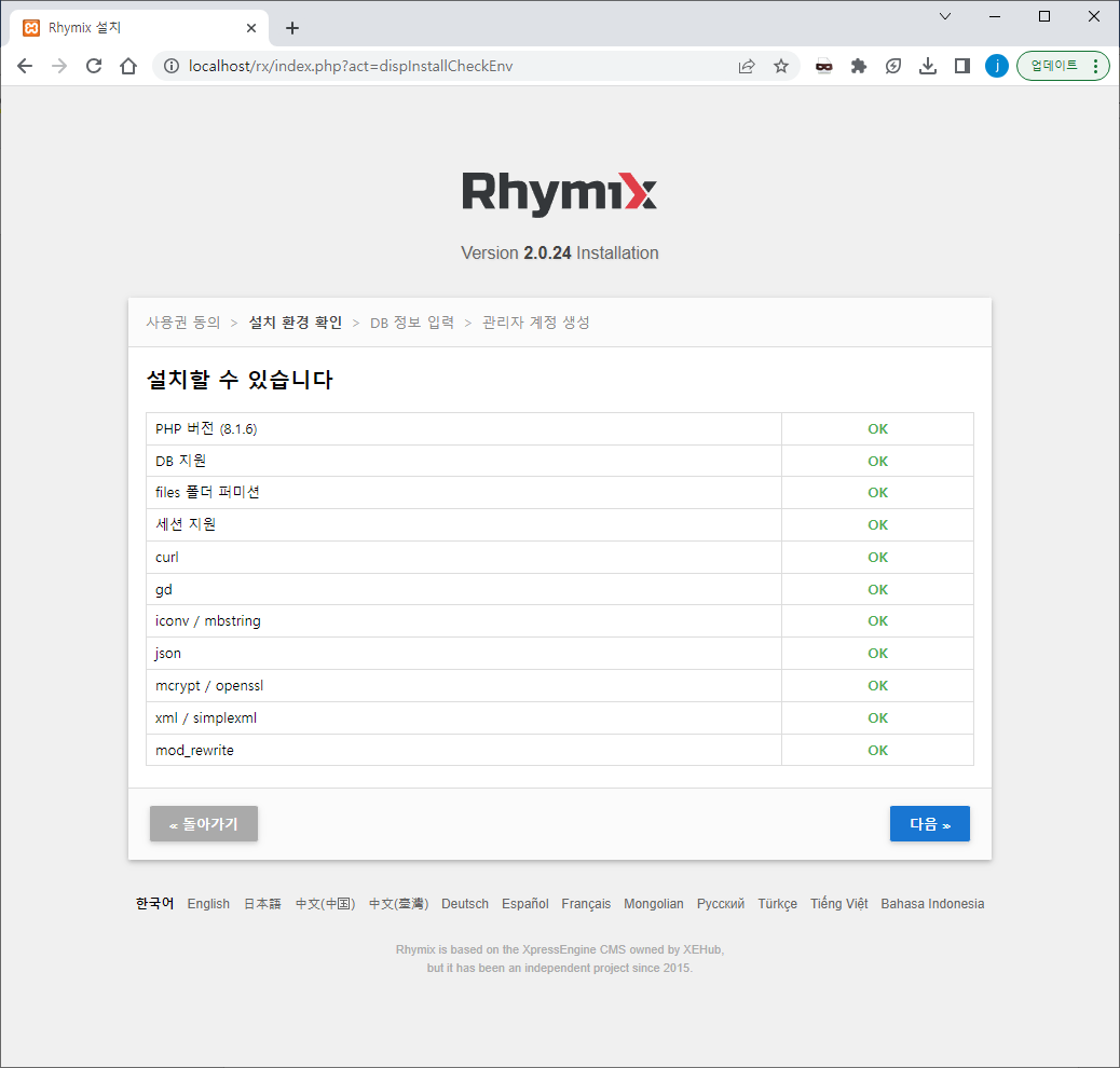웹 브라우저 주소창에 http://localhost/rx 입력해서 라이믹스 설치페이지로 들어간다.