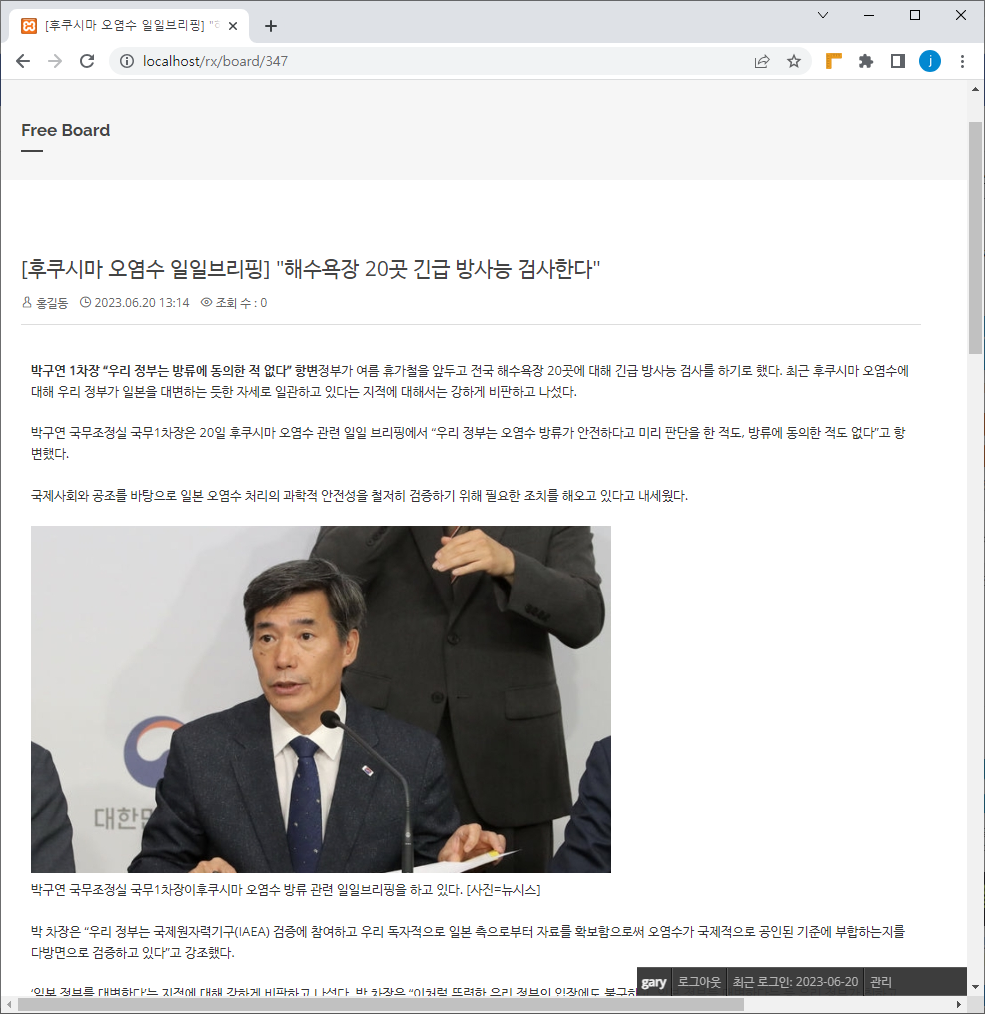 위소스를 실행시키면 네이버 뉴스 파싱 후 아래 처럼 게시판에 insert가 됩니다.
