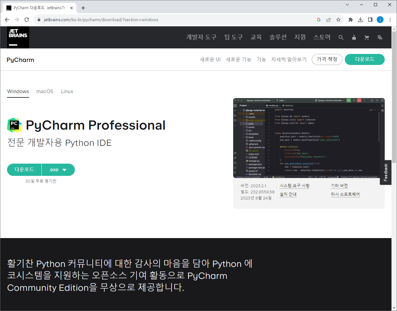 https://www.jetbrains.com/ko-kr/pycharm/download/?section=windows