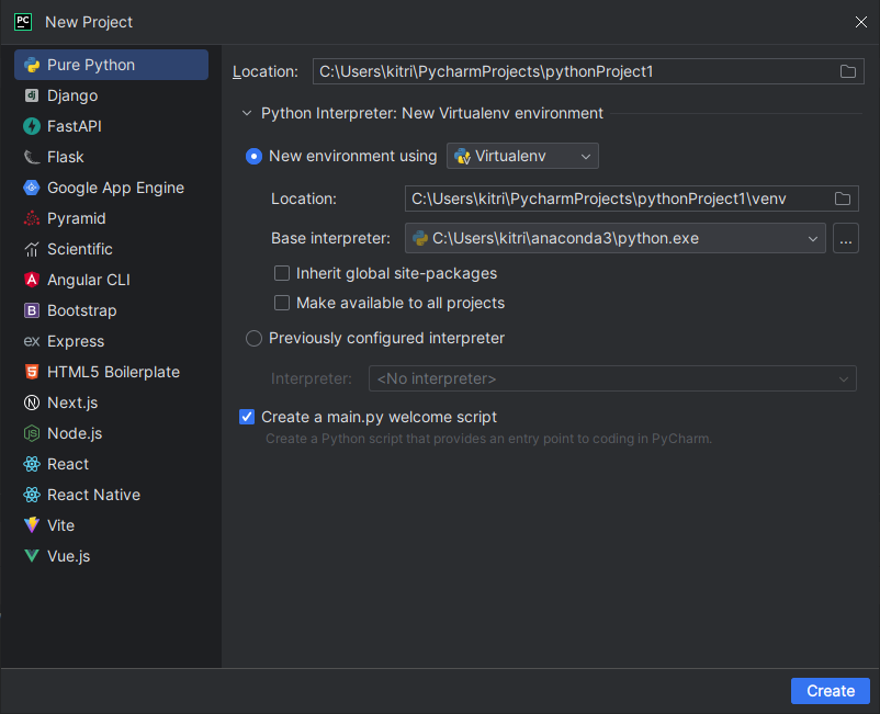 위에처럼 Base interpreter는 파이썬 설치한 경로의 python.exe 선택해주고 Location에 이름을 pythonProject1 이라고 한다.