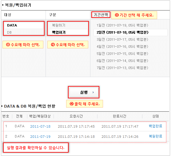 - 특정 DATA 파일 및 DB 테이블 복구를 원하신다면 '백업하기'를 이용하여 해당 날짜의 DATA/DB를 FTP로 다운로드하여 복구 해주시면 됩니다.