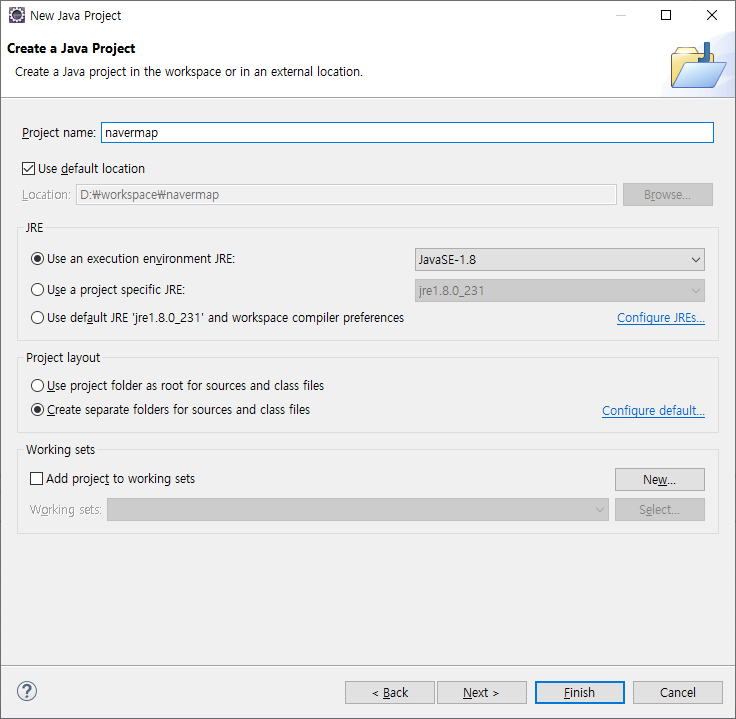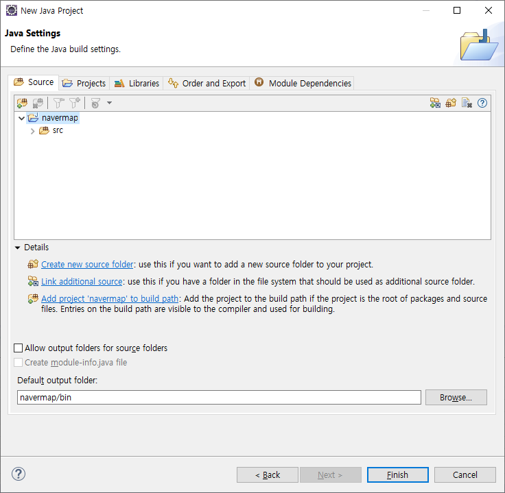 Project name: navermap 이라고 입력한 후 Next 버튼