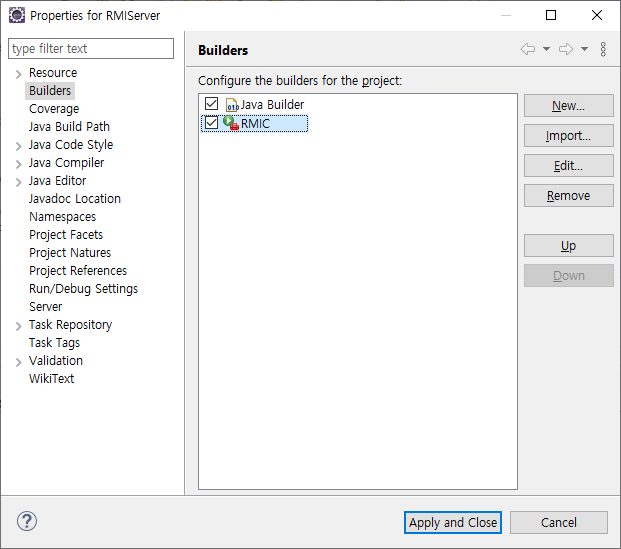 1) 우선 RMIServer 프로젝트의 설정을 열어 Builders 탭으로 갑니다. 거기서 New 버튼 클릭!