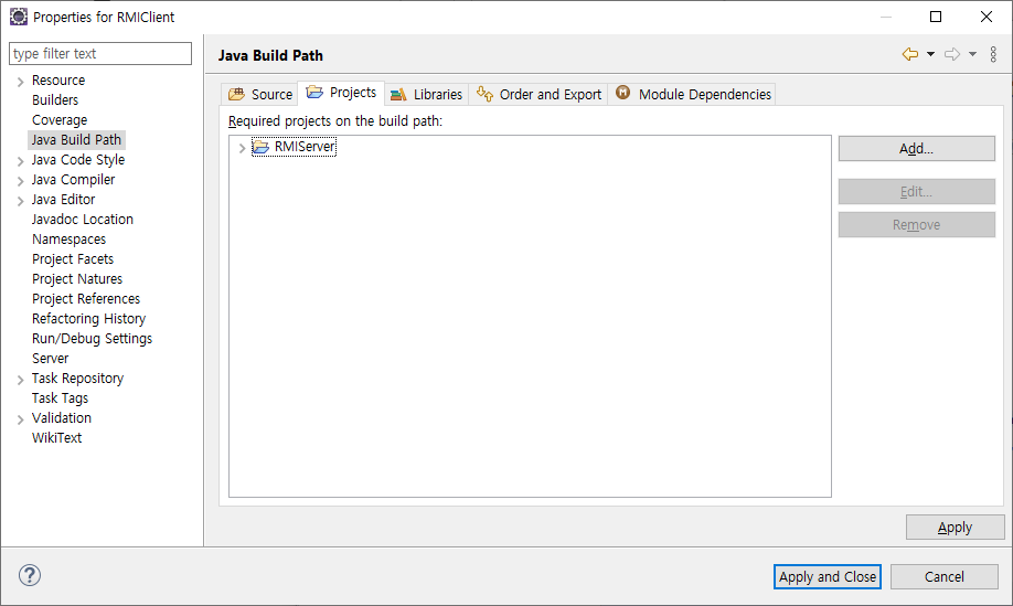 또한 import하지 않았다면 RMIClient 프로젝트 Properties -> Java Build Path -> Projects 탭에가서 RMIServer를 추가해줘야 한다. 안그러면 RMIClient 프로젝트의 RCMain.java 에서 RSInterface에 빨간 밑줄이 그어지면서 못찾는다.