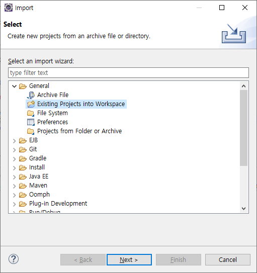 첨부 된 파일을 Package Explorer 에서 마우스 우클릭 > Import 클릭 > General > Existing Projects into Workspace 클릭