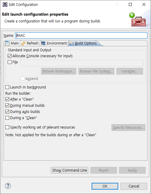 RMI 이클립스 플러그인도 있다고 하는데 이 프로젝트는 테스트를 위한 것이기에 기본적인 builder 의 기능을 설정해 사용해 봤습니다. 다음 설정은 이클립스에서 클래스 파일을 빌드할 때에 RMI 스텁 클래스를 생성하는 rmic.exe 를 같이 수행하도록 설정합니다.