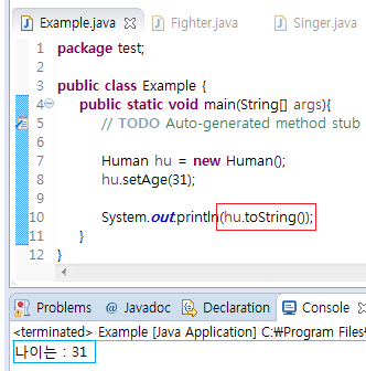 "Human"클래스의 객체를 생성하여 "toString" 메소드를 사용해 보았습니다.