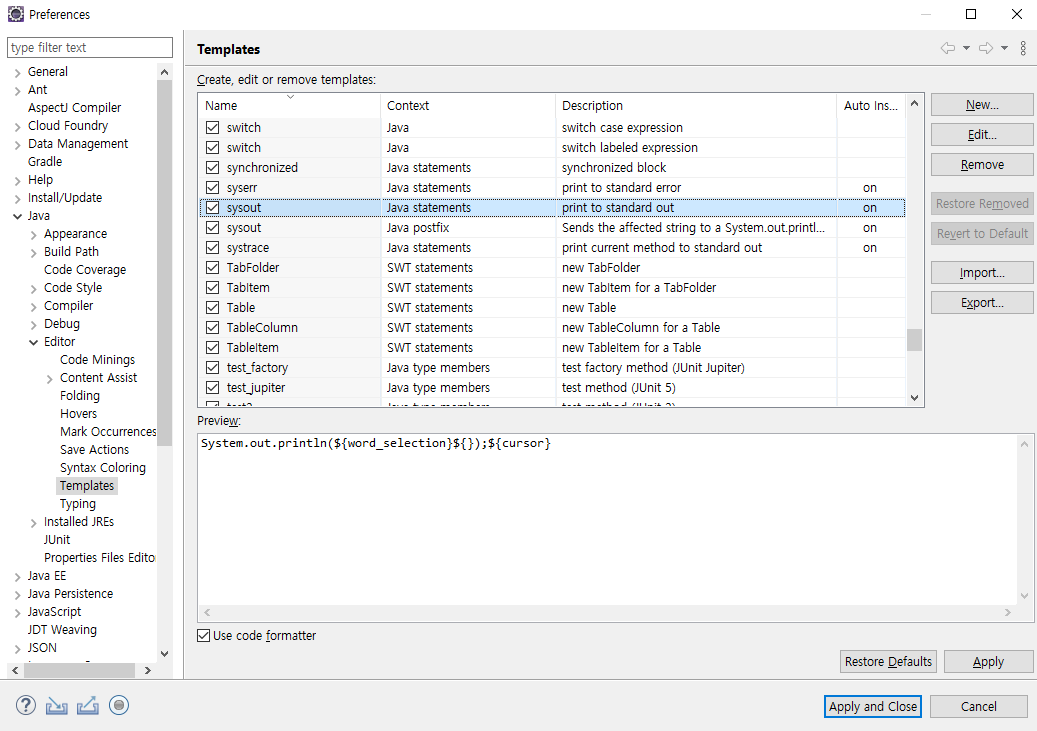 위 메뉴바에서 [Window] - [preference] - [Java] - Editor - Templates -[New]
