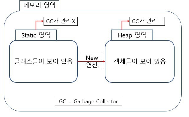 일반적으로 우리가 만든 Class는 Static 영역에 생성되고, new 연산을 통해 생성한 객체는 Heap영역에 생성됩니다. 객체의 생성시에 할당된 Heap영역의 메모리는 Garbage Collector를 통해 수시로 관리를 받습니다. 하지만 Static 키워드를 통해 Static 영역에 할당된 메모리는 모든 객체가 공유하는 메모리라는 장점을 지니지만, Garbage Collector의 관리 영역 밖에 존재하므로 Static을 자주 사용하면 프로그램의 종료시까지 메모리가 할당된 채로 존재하므로 자주 사용하게 되면 시스템의 퍼포먼스에 악영향을 주게 됩니다.