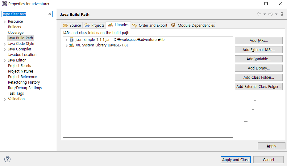 자바 json-simple-1.1.1.jar 파일을 import 하여