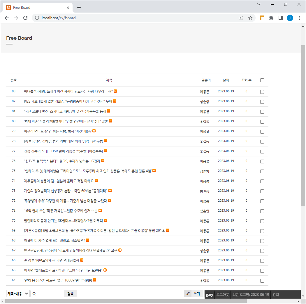위소스를 실행시키면 네이버 뉴스 파싱 후 아래 처럼 게시판에 insert가 됩니다.